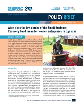 In 2021, Uganda established the Small Business Recovery Fund (SBRF) to support micro and small businesses adversely affected by the COVID-19 pandemic. However, the fund has experienced low uptake, particularly among women-owned enterprises, highlighting persistent challenges in accessing capital and resources for business recovery and growth. A recent survey by the Economic Policy Research Center (EPRC) identified several barriers faced by women entrepreneurs in accessing SBRF loans, including stringent collateral requirements, limited access to banking services, and disparities in loan amounts. We propose policy actions to address these issues, including increasing awareness among women abo...